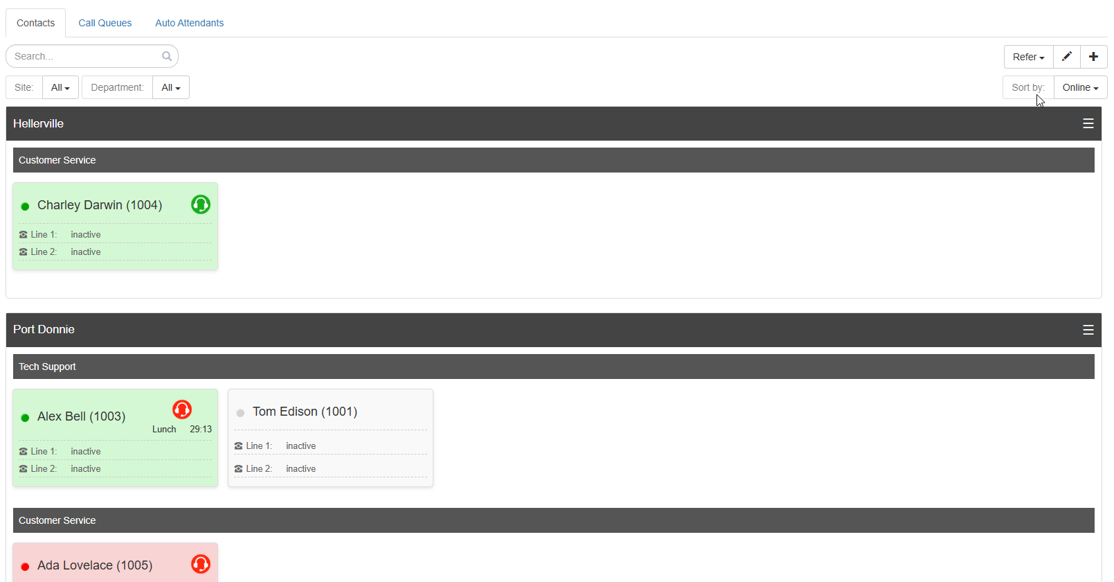 You can see whether or not an agent is busy based on the color to the left of their name. Notice below, a few users are solid red, indicating they are on active calls. One user, showing as red with a white line, indicating they are on DND.