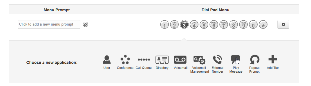- Add Tier = adds a submenu with a new greeting and set of options. Controls allow you to play an announcement and show a caller ID prefix.