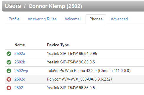 Phones – Here you can add, view, and manage a user’s hard or soft phones. Registered devices are indicated by a green or red circle next to the name or extension.
