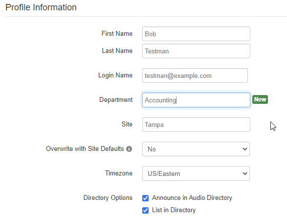 The Users tab is where you can add, remove, and edit users/extensions. Use the search bar to find a user by name or extension number. You can change the name, email, and e911 information under ‘Profile’, seen below. You can also reset their voicemail PIN.